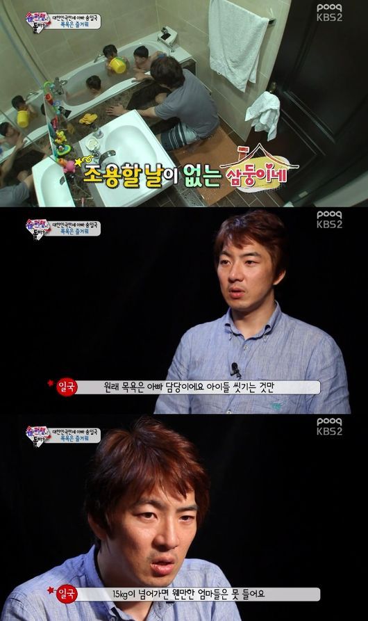 '슈퍼맨'의 송일국이 세 쌍둥이 목욕에 나섰다.