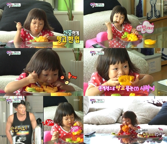 이어 혼자 과일접시를 옮기고 먼저 식사를 시작한 사랑이는 어른 뺨치는 망고 '먹방'을 선보였다. 처음에 포크로 망고를 찍어먹던 사랑이는 결국 손으로 망고를 통째로 들고 뜯는 못는 모습으로 추성훈을 놀라게 했다.