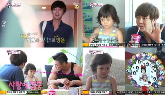 10일 오후 4시 방송된 KBS 2TV '해피선데이 - 슈퍼맨이 돌아왔다'에서는 추성훈과의 친분으로 집에 방문한 장근석이 사랑이의 관심을 얻기위해 고군분투하는 모습이 그려졌다.