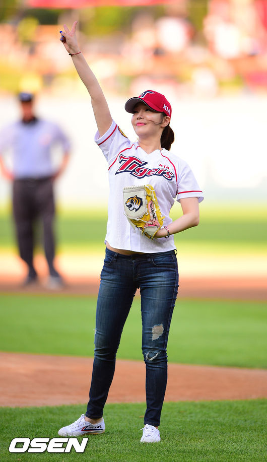 10일 광주-기아 챔피언스필드에서 열리는 2014 한국야쿠르트 세븐 프로야구 KIA 타이거즈와 롯데 자이언츠의 경기에 앞서 GS SHOP 쇼호스트 조윤주가 시구를 하고 있다.