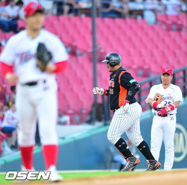 10일 광주-기아 챔피언스필드에서 열리는 2014 한국야쿠르트 세븐 프로야구 KIA 타이거즈와 롯데 자이언츠의 경기, 1회초 2사 1루 롯데 최준석이 선취 2점홈런을 날린후 베이스를 돌고 있다.