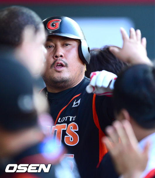 10일 광주-기아 챔피언스필드에서 열리는 2014 한국야쿠르트 세븐 프로야구 KIA 타이거즈와 롯데 자이언츠의 경기, 1회초 2사 1루 롯데 최준석이 선취 2점홈런을 날린후 동료들의 축하를 받고 있다.