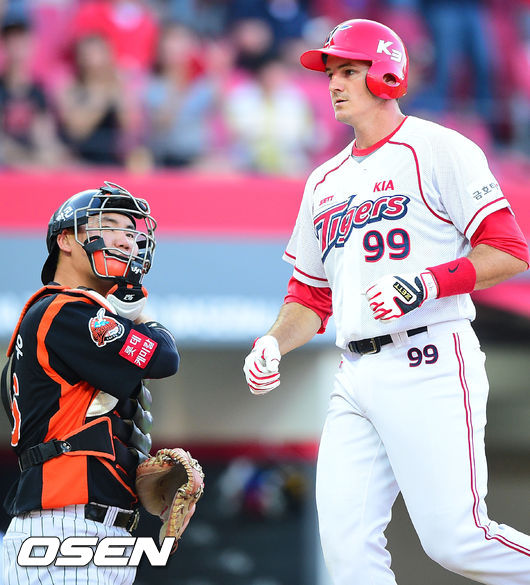 10일 광주-기아 챔피언스필드에서 열리는 2014 한국야쿠르트 세븐 프로야구 KIA 타이거즈와 롯데 자이언츠의 경기, 1회말 1사 1루 KIA 필이 동점 홈런을 날린 후 홈을 밟고 있다.