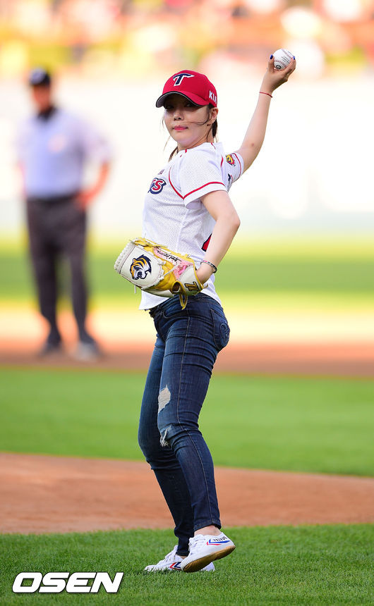 10일 광주-기아 챔피언스필드에서 열리는 2014 한국야쿠르트 세븐 프로야구 KIA 타이거즈와 롯데 자이언츠의 경기에 앞서 쇼호스트 조윤주가 시구를 하고 있다