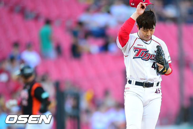 10일 광주-기아 챔피언스필드에서 열리는 2014 한국야쿠르트 세븐 프로야구 KIA 타이거즈와 롯데 자이언츠의 경기, 1회초 롯데 최준석에게 선취 2점 홈런을 허용한 KIA 선발투수 김병현이 아쉬워하고 있다