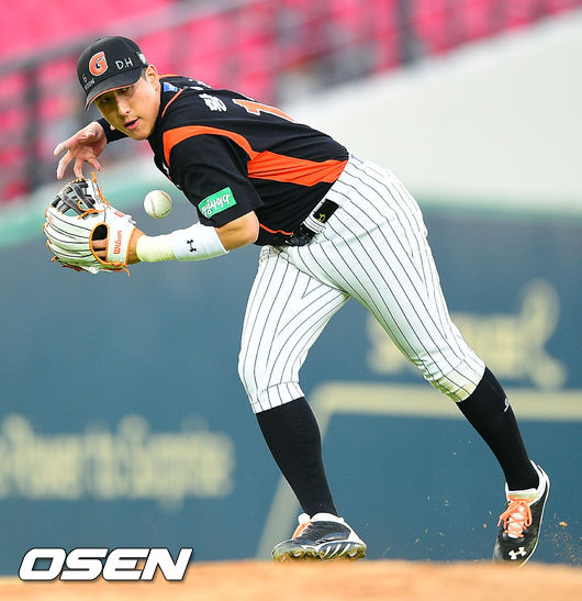 10일 광주-기아 챔피언스필드에서 열리는 2014 한국야쿠르트 세븐 프로야구 KIA 타이거즈와 롯데 자이언츠의 경기,2회말 1사 KIA 김다원의 내야안타때 롯데 황재균 3루수가 타구를 놓치고 있다.