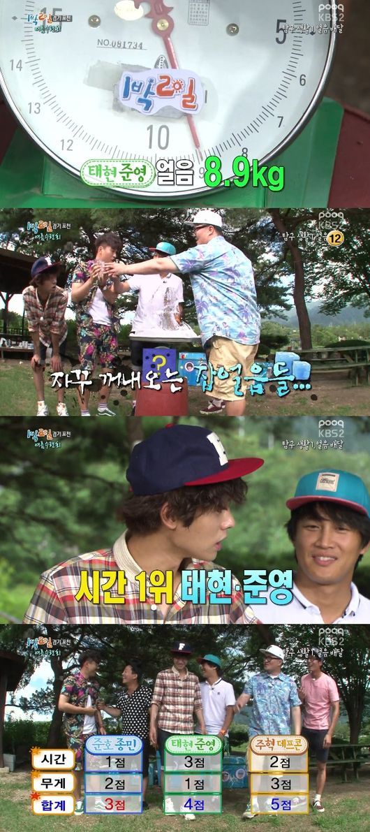 '1박2일'의 차태현과 정준영이 얼음 옮기기에서 1등을 차지했다.