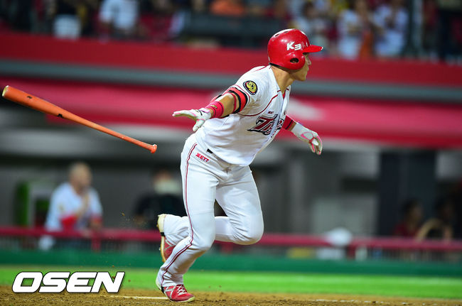 10일 광주-기아 챔피언스필드에서 열리는 2014 한국야쿠르트 세븐 프로야구 KIA 타이거즈와 롯데 자이언츠의 경기, 5회말 1사 만루 KIA 신종길이 3타점 3루타를 날리고 있다.
