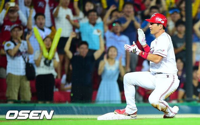 10일 광주-기아 챔피언스필드에서 열리는 2014 한국야쿠르트 세븐 프로야구 KIA 타이거즈와 롯데 자이언츠의 경기, 5회말 1사 만루 KIA 신종길이 3타점 3루타를 날리고 3루에 세이프 되고 있다.