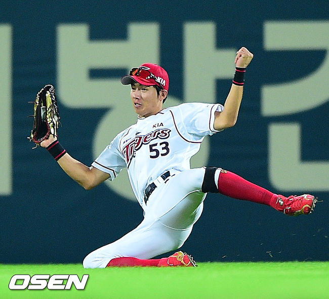 10일 광주-기아 챔피언스필드에서 열리는 2014 한국야쿠르트 세븐 프로야구 KIA 타이거즈와 롯데 자이언츠의 경기, 6회초 2사 1,2루 롯데 장성우의 타구를 KIA 이대형 중견수가 호수비 펼치며 잡아내고 있다.