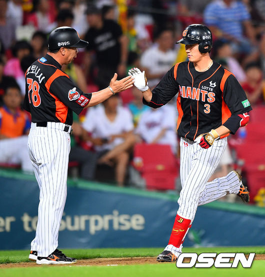 10일 광주-기아 챔피언스필드에서 열리는 2014 한국야쿠르트 세븐 프로야구 KIA 타이거즈와 롯데 자이언츠의 경기,7회초 롯데 선두타자 오승택이 솔로홈런을 날린뒤 모토니시 코치와 하이파이브를 하고 있다.
