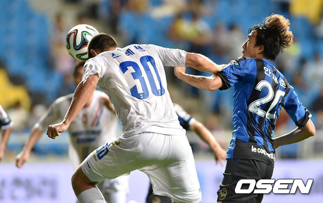 후반 경남 스레텐이 헤딩슛을 시도하고 있다. /sunday@osen.co.kr