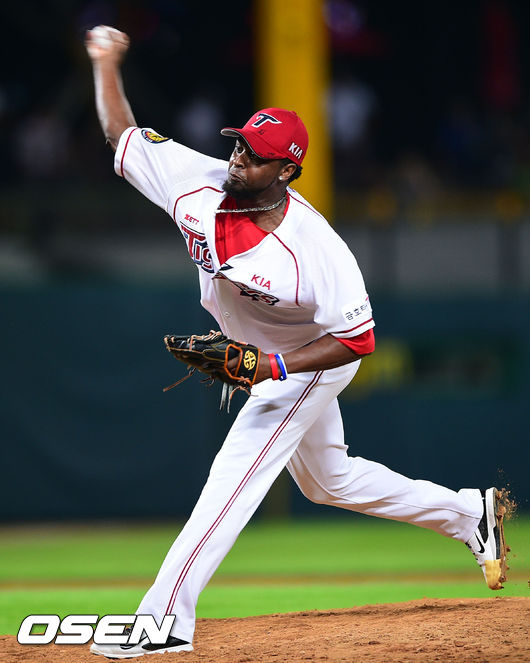10일 광주-기아 챔피언스필드에서 열리는 2014 한국야쿠르트 세븐 프로야구 KIA 타이거즈와 롯데 자이언츠의 경기, 9회초 KIA 마무리 투수 어센시오가 역투하고 있다.