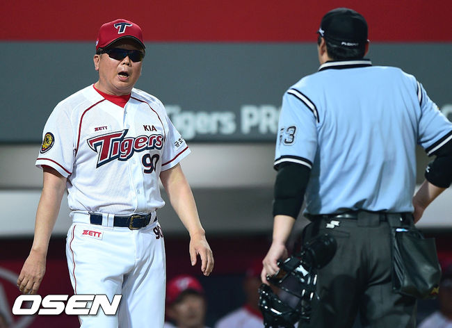 10일 광주-기아 챔피언스필드에서 열리는 2014 한국야쿠르트 세븐 프로야구 KIA 타이거즈와 롯데 자이언츠의 경기, 9회초 2사 1,2루 롯데 전준우에게 볼넷을 허용한 KIA 선동렬 감독이 이계성 구심에게 항의하고 있다.