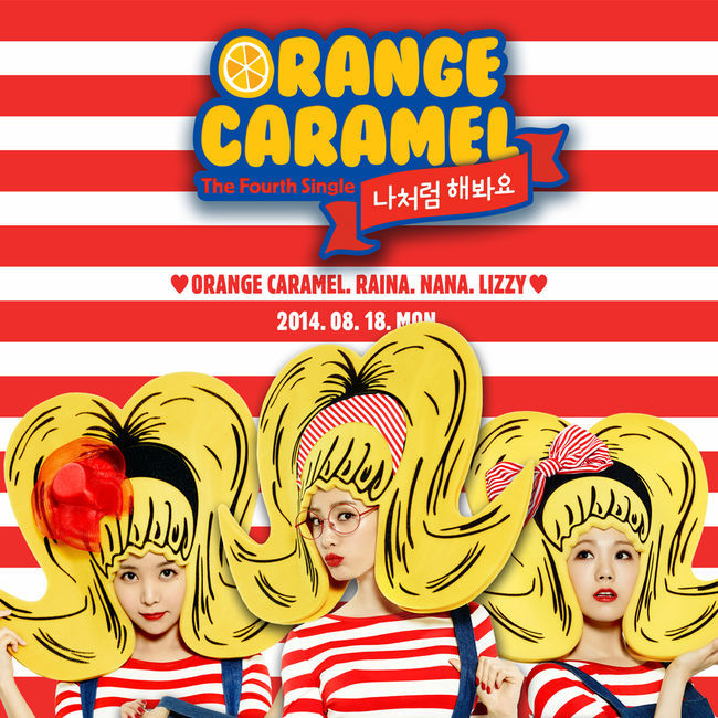 이날 공개된 사진 속 오렌지캬라멜 멤버들은 빨간 줄무늬를 배경으로 줄무늬 티셔츠와 노란색 가발을 쓰고 있다. 특히 빨간 줄무늬에 맞춘 빨간 리본과 레드립으로 컬러를 맞춘 오렌지캬라멜 멤버들은 재미 있는 표정을 짓고 있어 ‘나처럼 해봐요’에 대한 기대감을 높이고 있다.