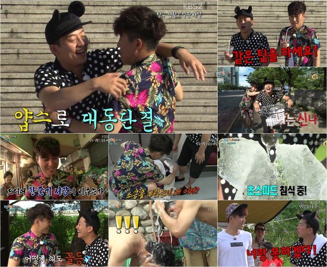 우여곡절 끝에 중간 점검하는 장소에 도착한 두 사람은 커닝을 하는 얕은 꼼수를 쓰다 얼음을 더 많이 녹이게 돼 결국 첫 번째 미션에서 꼴등을 하게 됐다. 점심으로 생수 두 병만을 받게 된 김준호는 차태현이 막걸리를 주자 원샷을 하고선 “취했으니 어쩔 수 없다”며 주정뱅이 같은 모습을 보여 깨알 웃음을 자아냈다.