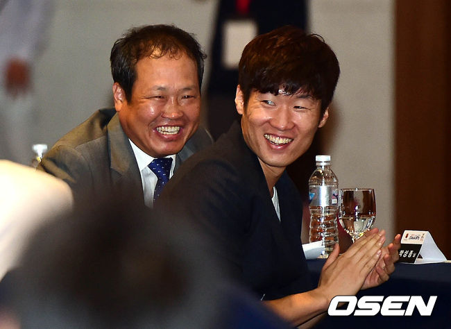 11일 오전 강원도 평창군 알펜시아에서 열린 '2014 JS 유소년 드림컵' 개막식에서 박지성이 부친 박성종 씨와 미소를 짓고 있다.