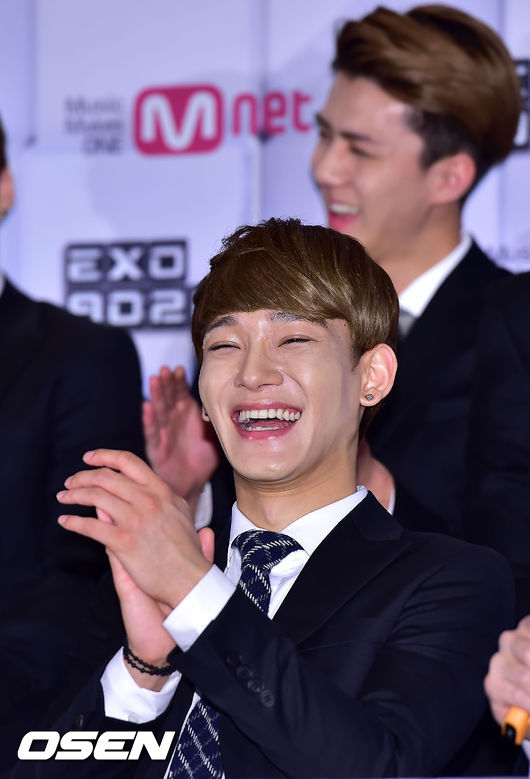 11일 오전 서울 마포구 상암동 CJ E&M센터 1층 미디어홀에서 열린 엠넷 '엠넷 K-POP 타임슬립 EXO 90:2014 (이하 엑소 902014)' 기자간담회에서, 엑소의 첸이 환하게 웃고 있다.