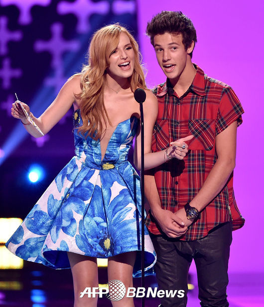 할리우드 여배우 벨라 손과 웹 비디오 스타 카메론 댈러스가 행사를 진행하고 있다.