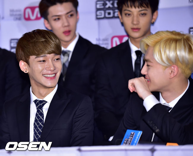 11일 오전 서울 마포구 상암동 CJ E&M센터 1층 미디어홀에서 열린 엠넷 '엠넷 K-POP 타임슬립 EXO 90:2014 (이하 엑소 902014)' 기자간담회에서, 엑소의 첸과 수호가 즐겁게 얘기를 나누고 있다.