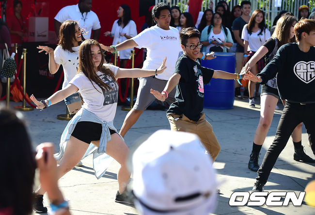 11일(이하 한국시간) 미국 캘리포니아주 로스앤젤레스 LA 메모리얼 스포츠 아레나에서 열리는 '엠넷 엠카운드다운 왓츠 업 LA'공연에 앞서 열린 레드카펫 행사에서 팬들이 춤을추고 있다.