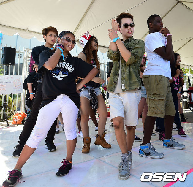 11일(이하 한국시간) 미국 캘리포니아주 로스앤젤레스 LA 메모리얼 스포츠 아레나에서 열리는 '엠넷 엠카운드다운 왓츠 업 LA'공연에 앞서 열린 레드카펫 행사에서 팬들이 멋진 춤을 선보이고 있다.