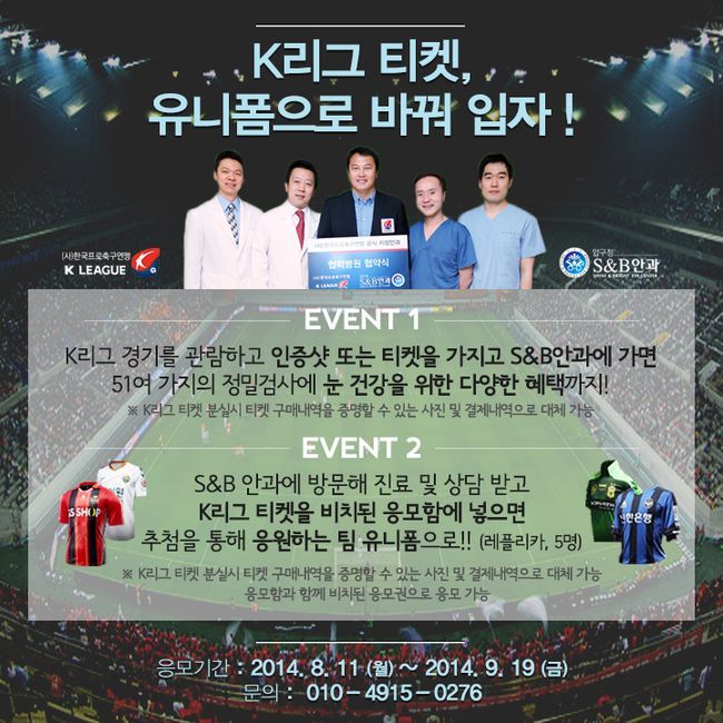 이벤트는 8월 11일부터 9월 12일까지 진행되며, 참여 방법은 2014 K리그 시즌권 또는 2014년 7월부터 9월까지 약 2달동안의 K리그 직관을 확인할 수 있는 예매권, 인증샷, 입장권 등을 가지고 S&B안과에 방문하면 된다. 이벤트에 응모하는 모든 K리그 팬에게는 51여 가지의 안과 정밀 검사 및 눈 건강을 위한 다양한 혜택이 제공된다. 또한, 응모한 사람 중 추첨을 통해 총 3명에게 응원하는 팀의 레플리카 유니폼을 증정한다.