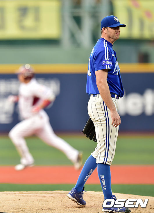 11일 오후 서울 목동 야구장에서 열린 '2014 한국야쿠르트 세븐 프로야구' 넥센 히어로즈와 삼성 라이온즈의 경기, 1회말 1사 넥센 이택근이 우월 선취 솔로홈런을 날린 후 그라운드를 돌고 있을때 삼성 선발 밴덴헐크가 아쉬운 표정을 짓고 있다.
