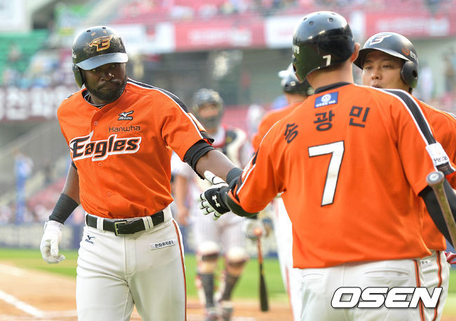1회초 1사 만루에서 한화 피에가 만루 홈런을 치고 홈에서 동료들과 환호하고 있다.