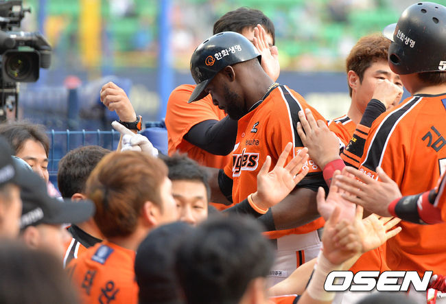 1회초 1사 만루에서 한화 피에가 만루 홈런을 치고 더그아웃에서 동료들과 환호하고 있다.