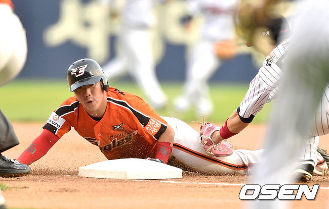 1회초 1사 1루에서 한화 정근우가 2루 도루를 시도, 공이 빠지자 3루로 쇄도해 세이프 되고 있다.