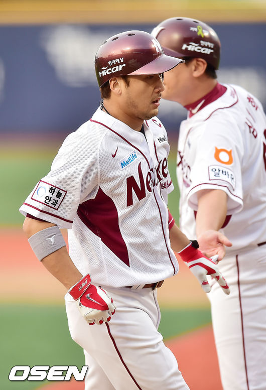 11일 오후 서울 목동 야구장에서 열린 '2014 한국야쿠르트 세븐 프로야구' 넥센 히어로즈와 삼성 라이온즈의 경기, 1회말 1사 넥센 이택근이 우월 선취 솔로홈런을 날린 후 홈에서 심재학 코치와 하이파이브를 하고 있다.