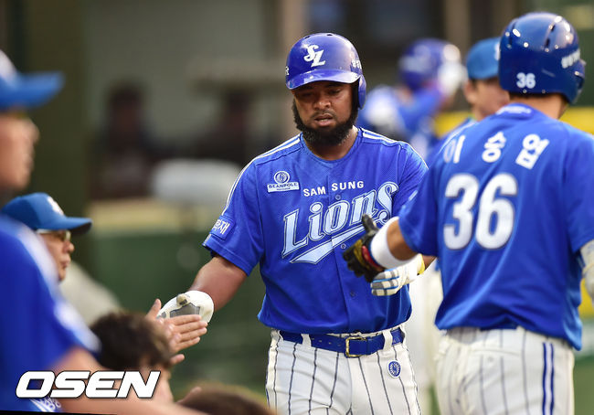 11일 오후 서울 목동 야구장에서 열린 '2014 한국야쿠르트 세븐 프로야구' 넥센 히어로즈와 삼성 라이온즈의 경기, 3회초 2사 주자 2루 삼성 채태인의 좌중간 1타점 적시타때 홈을 밟은 나바로가 덕아웃에서 동료들과 하이파이브를 하고 있다.