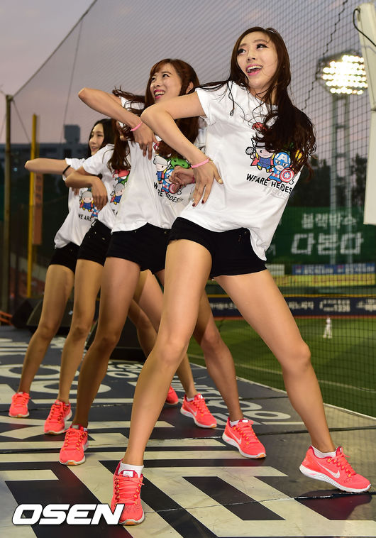 11일 오후 서울 목동 야구장에서 열린 '2014 한국야쿠르트 세븐 프로야구' 넥센 히어로즈와 삼성 라이온즈의 경기, 넥센 치어리더가 무대 위에서 화려한 공연을 펼치고 있다.