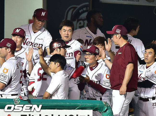 11일 오후 서울 목동 야구장에서 열린 '2014 한국야쿠르트 세븐 프로야구' 넥센 히어로즈와 삼성 라이온즈의 경기, 4회말 1사 주자 2루 넥센 박병호가 중월 투런 홈런을 날린 후 덕아웃에서 동료들과 하이파이브를 하고 있다.