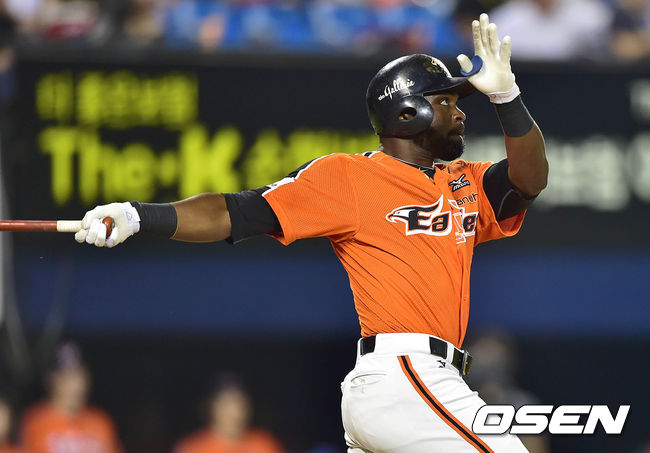 6회초 2사에서 한화 피에가 우전 2루타를 치고 있다.