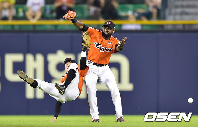6회말 무사 1루에서 한화 강경학과 피에가 충돌하며 LG 채은성의 타구를 놓치고 있다.