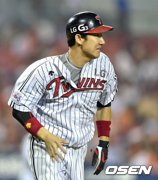 7회말 1사 1루에서 LG 손주인이 좌중간 적시 2루타를 치고 그라운드를 달리고 있다.