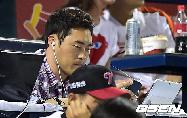 은퇴 후 전력분석원으로 활동하고 있는 조성환이 경기를 바라보고 있다.