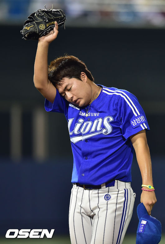11일 오후 서울 목동 야구장에서 열린 '2014 한국야쿠르트 세븐 프로야구' 넥센 히어로즈와 삼성 라이온즈의 경기, 7회말 2사 주자 2루 넥센 박병호를 삼진으로 잡아낸 후 삼성 심창민이 땀을 닦으며 덕아웃으로 향하고 있다.