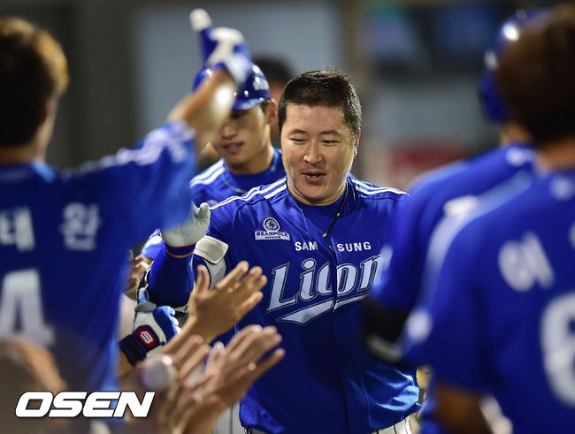 11일 오후 서울 목동 야구장에서 열린 '2014 한국야쿠르트 세븐 프로야구' 넥센 히어로즈와 삼성 라이온즈의 경기, 8회초 1사 주자 3루 삼성 최형우가 우월 동점 투런 홈런을 날린 후 덕아웃에서 동료들과 하이파이브를 하고 있다.