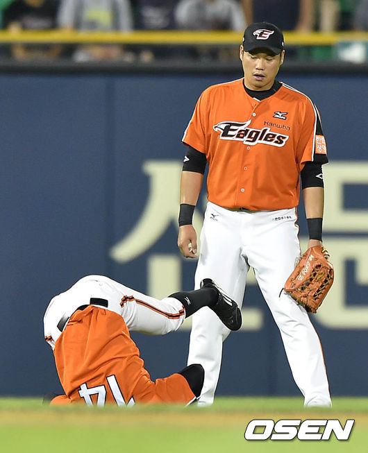 9회말 무사에서 한화 강경학이 LG 스나이더의 타구를 잡으며 넘어지고 있다.