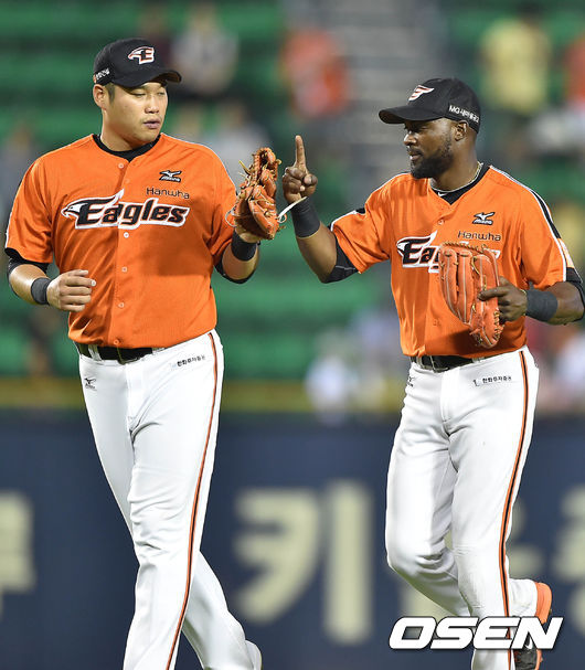 경기 종료 후 한화 최진행과 피에가 승리의 기쁨을 나누고 있다. /sunday@osen.co.kr