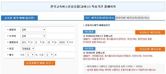 레츠코레일 홈페이지에서 추석 기차표 예매에 실패한 경우, 코버스에서 진행하는 고속버스 예매를 노리는 것도 방법이다. 코버스는 홈페이지(http://www.kobus.co.kr/web/index.jsp)를 통해 특송기간 홈페이지에서 고속버스 예매 시스템을 운영하고 있다.