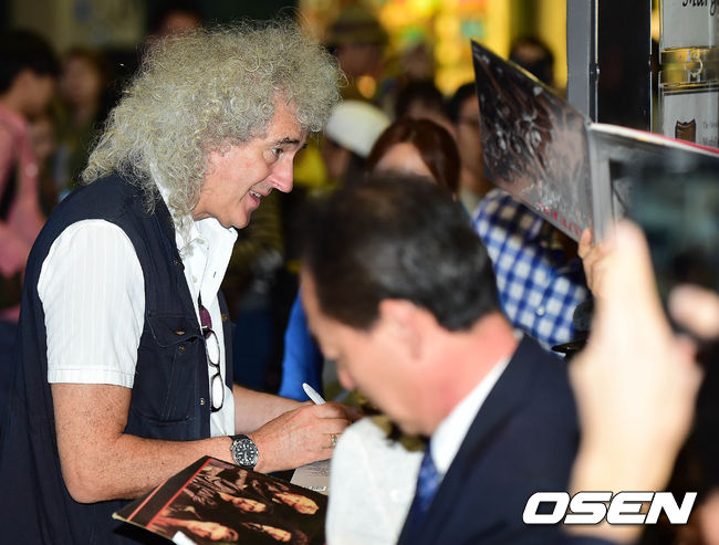 브라이언 메이가 입국장을 찾은 한국 팬들에게 사인을 해주고 있다.