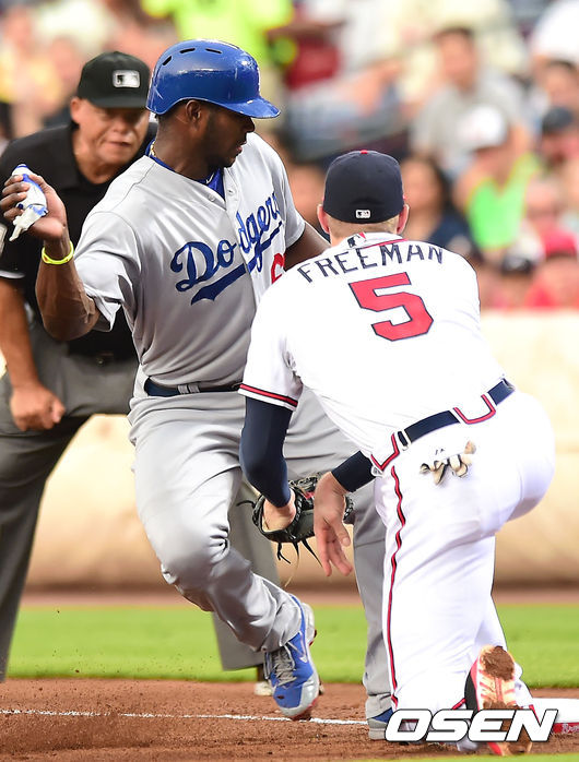 4회초 1사 1루 다저스 푸이그가 애틀란타 테헤란의 견제구에 아웃당하고 있다.