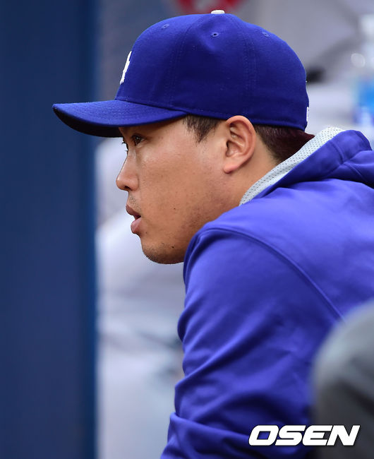 다저스 류현진이 더그아웃에 앉아 경기를 관전하고 있다.