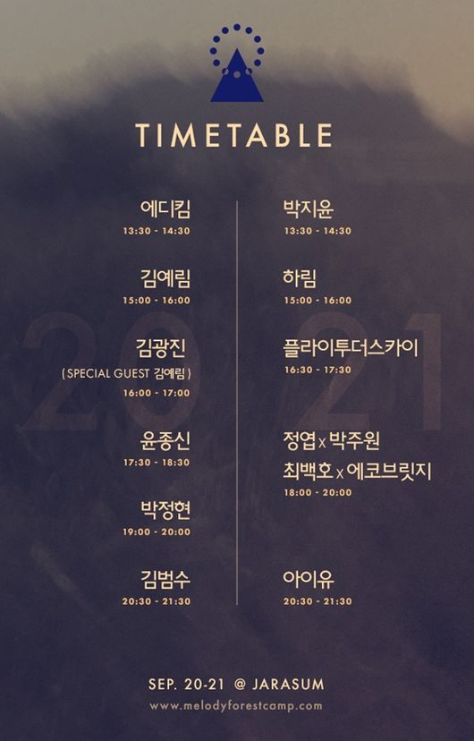 타임테이블에 따르면 내달 20일~21일 양일간 가평군 자라섬에서 개최되는 ‘멜로디 포레스트 캠프’ 페스티벌 첫째 날은 에디킴, 김예림, 김광진, 윤종신, 박정현, 김범수가 무대에 선다.