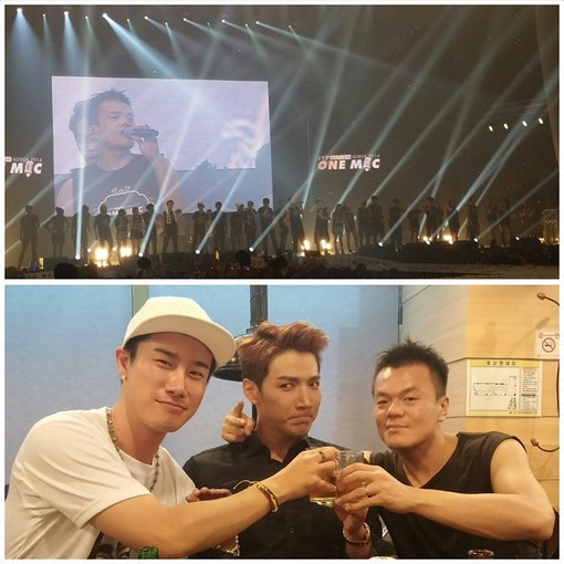 공개된 사진 속에는 열기가 느껴지는 콘서트 현장과 준케이와 박진영이 함께한 뒷풀이 모습이 함께 담겨있다. 특히 산이는 두 사람과 술잔을 기울이며 기쁜 듯 미소짓고 있어 보는 이들의 시선을 사로잡는다.