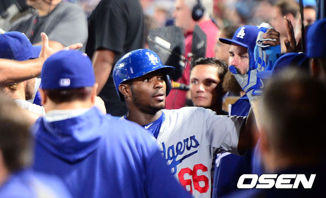 8회초 1사 2,3루 다저스 푸이그가 크로포드의 적시타로 득점을 올린 뒤 기뻐하고 있다./youngrae@osen.co.kr